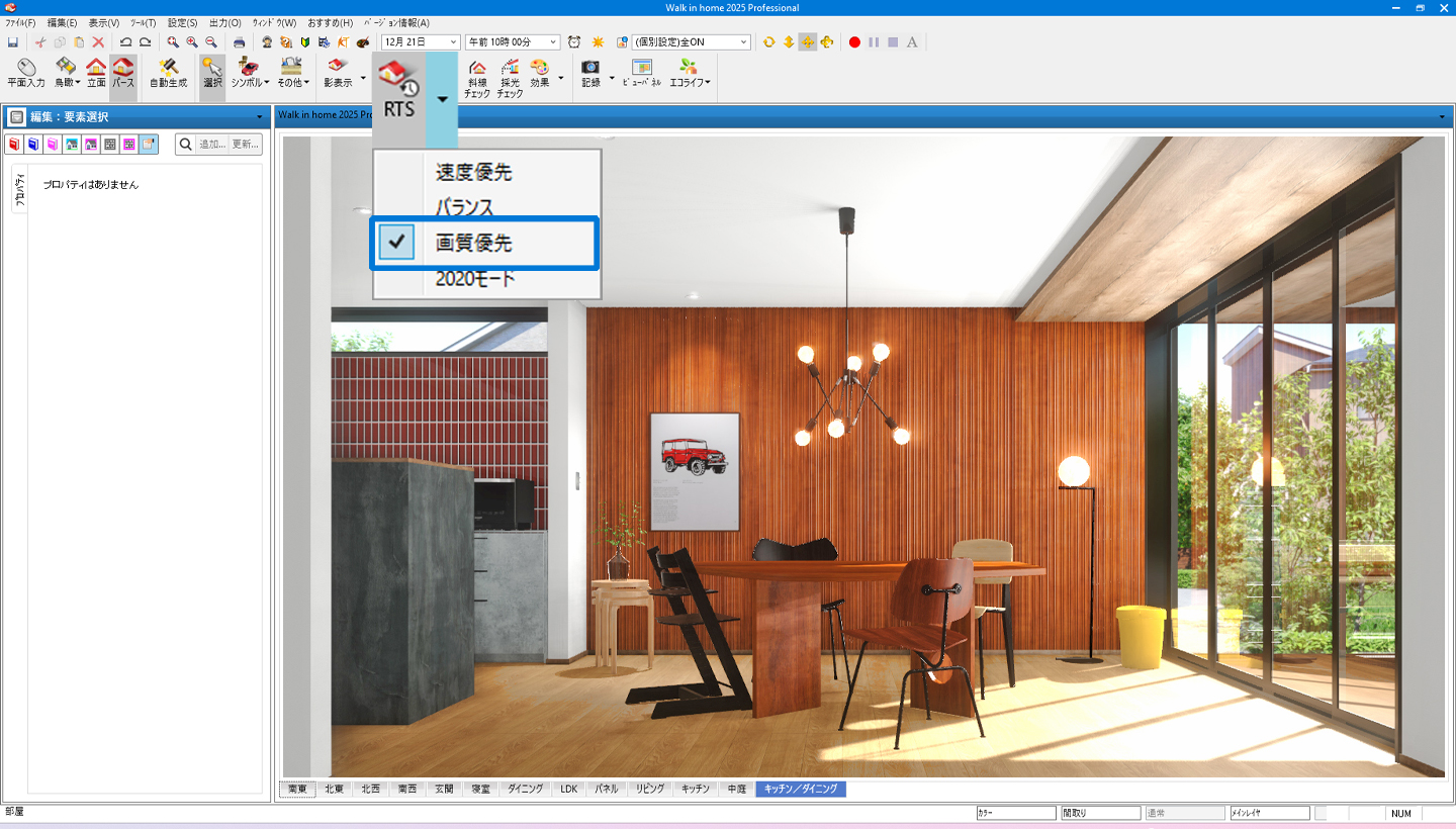 RTS「画質優先」モードのライティング品質を向上しました。窓から差し込む光がより自然に空間へ広がり、小物や家具にも柔らかな影を落とします。奥行きと雰囲気が一層リアルになった、臨場感あふれる内観をご体感ください。