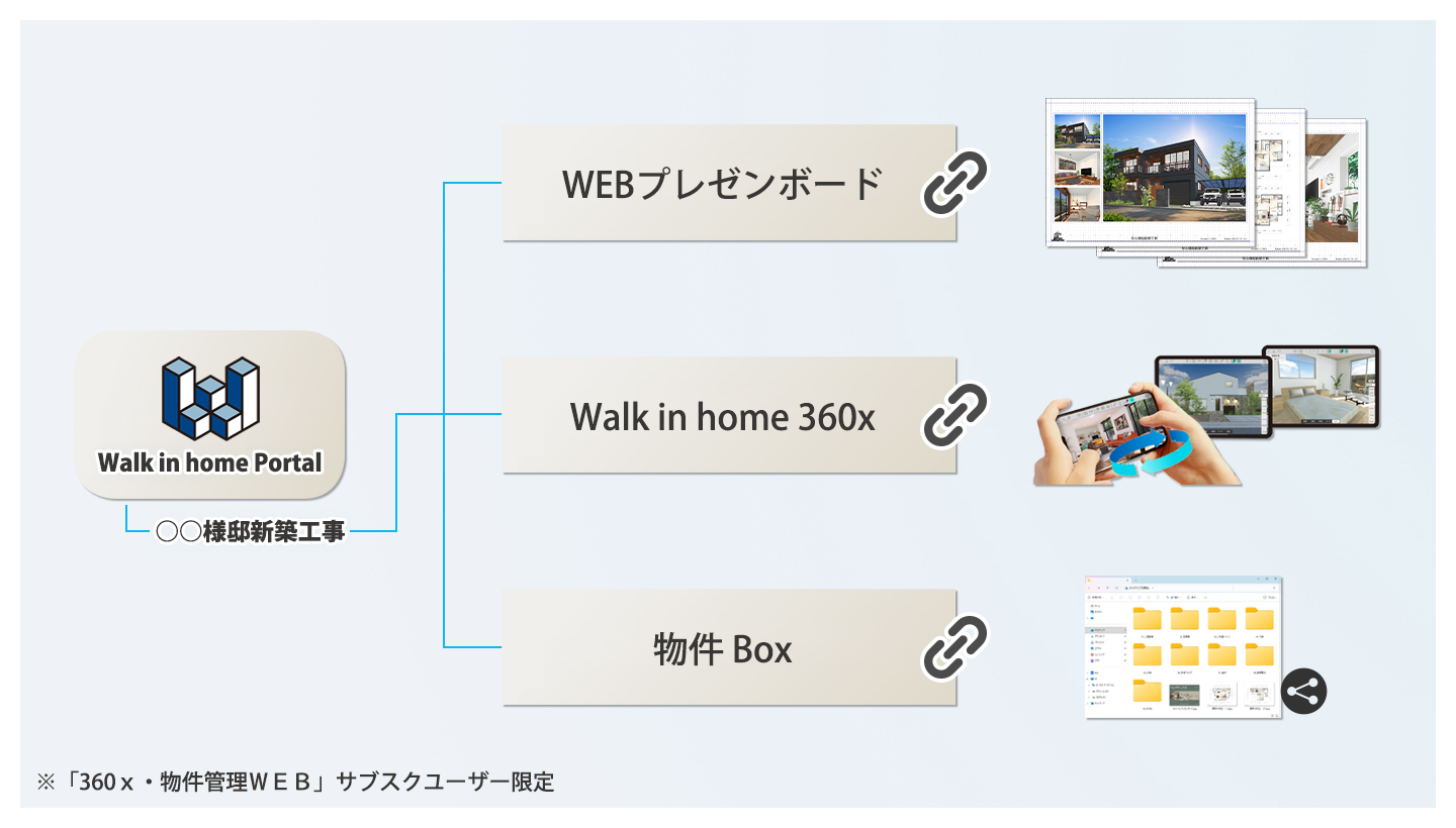 出力したプレゼンボードをWalk in home Portalへアップロードし、専用の「施主ページ」としてお施主様に公開できるようになりました。これにより、プレゼンボードや資料の共有・提案が簡単に行え、スピーディな情報連携を実現します。